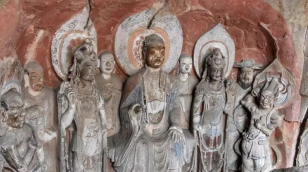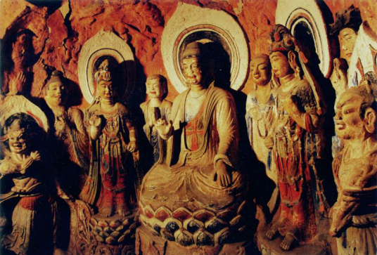 东龛,方形双重龛,龛内有造像9尊,为一佛二菩萨二弟子二供养人二力士,称为“东方三圣”。龛外沿两侧原刻有140尊小佛,现存68尊。龛顶刻天龙八部,为浅浮雕,形象丰满,刀法流畅;西龛,方形双重龛,共有造像55尊,称之为“西方三圣”。龛的左右两臂,分别刻有26个闻法菩萨,合为52数,均呈高浮雕。众菩萨的脸形半圆,眉眼平直,其姿态各异,或双手抱膝而坐,或支手托腮,或双手合十,或作思维状等。西龛的龛门为莲瓣形,龛楣和龛额上刻卷草,龛额上还有浮雕的七佛。龛门外右臂上有一则唐贞观八年(634年)的造像碑记,碑首题“阿弥陀佛并五十二菩萨传,邓元觉书,作龛及镌子杨字尚”;北龛,圆拱形,共有造像9尊,为一佛二菩萨二弟子二供养人二力士,称“华严三圣”龛。龛外左侧上方有“中和四年……修粧”等题记。