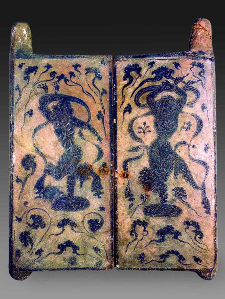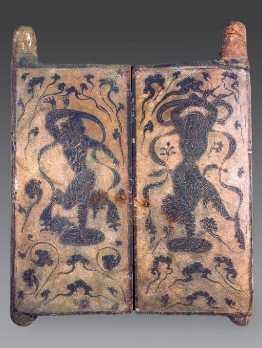 石门是成套的两扇,单扇长89厘米,宽43厘米,厚5厘米,上下圆柱形门枢高十三厘米,直径十厘米;石门单扇呈长方形,两门面闭合处各有一孔,出土时用铁锁相扣。门扇正面凿磨光滑中间各一剔地浅浮雕胡旋舞舞伎。从腰肢胸围可以看出,左扇门刻一女伎,右扇门刻一男伎。舞者发束带,身着圆领紧身窄袖衫,下着裙带贴腿,脚穿长简皮靴,各踩在一小圆毯上,双人对舞。舞姿造型略有不同,左边舞伎侧身回首,左脚站立圆毯上,右脚后屈,左手微微上举,右臂屈至头顶;右侧男伎右脚立毯上,左腿前伸,双臂上屈至头顶上方合拢。两人均手举长巾,熟练挥旋。四周剔地浅浮雕卷云纹。白居易《胡旋女》诗有注曰:“胡旋女为天宝末康居国所献”,是为唐玄宗时代(712~756年)。然窨子梁唐墓群的墓志又载明了墓主人卒于唐武周久视元年(700年),则是武则天时代(690~705年)了,这就把胡旋舞传入中国的时间提前了几十年。