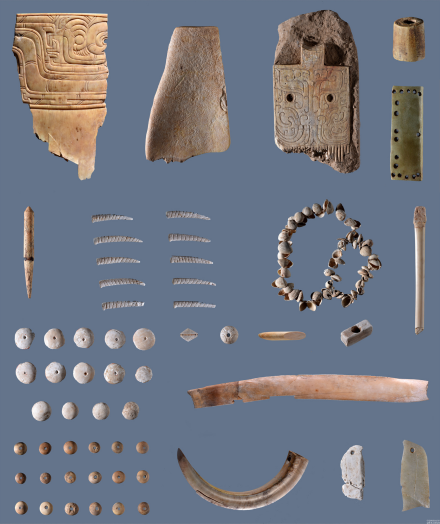 甲字形墓葬出土青铜车器有轭、衡末饰、轴、軎、毂、伏兔、泡饰等,另有玉璧、骨梳、蚌器、甲骨文等。中型墓葬有棺椁、腰坑殉狗,出土鼎、觯、泡等青铜器,瓿、豆罐等原始瓷器,柄形器、鱼、蝉、螳螂等玉器。骨簪、骨梳、骨珠,费昂斯珠、绿松石、玛瑙珠等。小型墓仅有一棺、腰坑殉狗,随葬陶器鬲、罐等。遗址灰坑及墓葬出土卜骨和卜甲计7块,其中有文字的2块,总计发现文字约50余字。