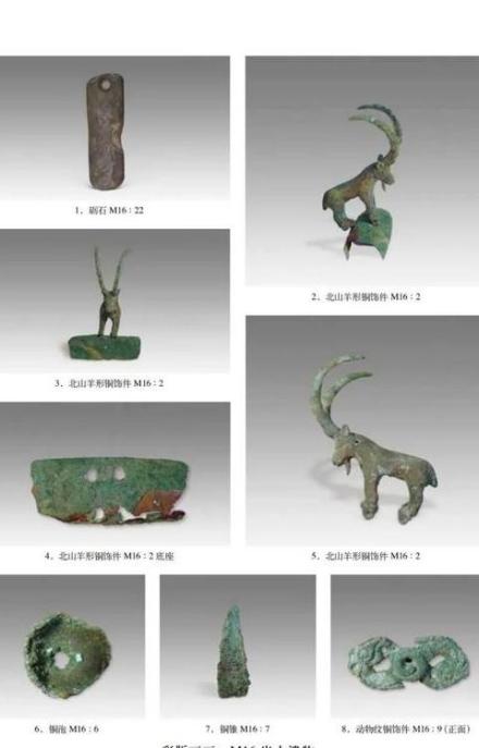 铜器有刀、扣、马衔、管状饰件等,刀为长条形,柄刃分明。有一件环首铜刀较有特点,环呈椭圆形,刀体也为直柄直刃。扣多圆形,背部有钮,一件扣呈长方形,表面镂空似带有螺旋纹。出土的一件管状饰件,其上铆接一站立的北山羊,2只大角醒目,口、鼻、目、耳分明,下颌有一撮长须,浑圆的身体,健硕的四肢,短尾下垂,张目远眺,为史前新疆铜器类型中的新发现。