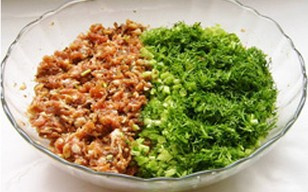 3. 将茴香苗切末,与腌好的猪馅肉搅拌均匀 |