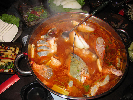 红酸汤鱼:1.将西红柿片、姜块、干辣椒煮沸,捞出只要水,放入红酸汤、木姜子和蒜,搅拌后放入鱼,煮熟即可,上桌后放入葱、豆腐和各种蔬菜。(这是各地流行的做法,因为红酸汤超市里有成品料出售,使用方便)