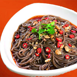 蕨根粉,看起来就像是黑色的粉丝,它是从野生蕨菜的根里面提炼出的淀粉做成的粉丝。因为蕨菜的根是紫色,所以做出粉丝后颜色很深。蕨根粉保留了蕨菜里的大部分营养,虽其貌不扬,却营养丰富。尤其在吃多了油腻的食物之时,来一盘爽口的酸辣蕨根粉,调节油腻的肠胃,着实让人振奋。