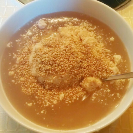 17. 糕粑倒入藕粉里,加入玫瑰蜂蜜,芝麻,花生碎 |