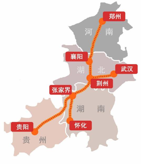 另外一个是,湖北提出了建设襄阳-荆门-荆州-常德的城际铁路,这样从常德到贵阳修建铁路后,贵阳到郑州也可以实现直达。