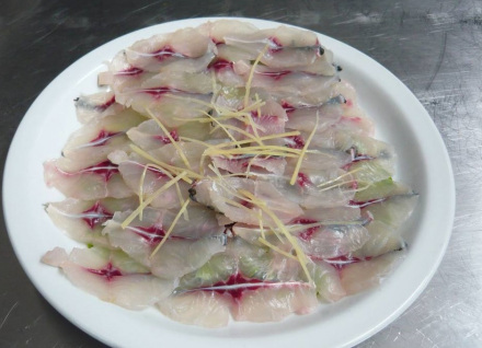 3、将鱼宰杀洗净,把鱼肉切成片,放入沸水中氽熟,捞出码在已垫底料的盘上,淋上姜汁拌匀,撒上香菜即可。