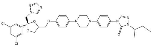 伊曲康唑(Itraconazole),是一种有机化合物,化学式为C35H38Cl2N8O4,为三唑类高效广谱抗真菌药,可结合真菌细胞色素P450同工酶,抑制麦角甾醇合成。伊曲康唑对皮肤癣菌、念珠菌属、新生隐球菌、糠秕孢子菌属、曲霉菌属、组织胞浆菌属、巴西副球孢子菌、申克孢子丝菌、着色真菌属、枝孢霉属、皮炎芽生菌等感染有效。