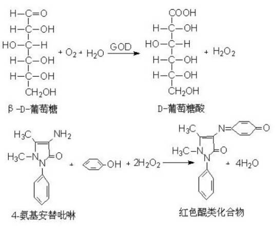 god-pod法即葡萄糖氧化酶法,可以用来测定血清(浆)葡萄糖。葡萄糖氧化酶(glucose oxidase,GOD)利用氧和水将葡萄糖氧化为葡萄糖酸,并释放过氧化氢。过氧化物酶(peroxidase,POD)在色原性氧受体存在时将过氧化氢分解为水和氧,并使色原性氧受体4-氨基安替比林和酚去氢缩合为红色醌类化合物,即Trinder反应。红色醌类化合物的生成量与葡萄糖含量成正比。