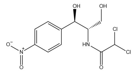 氯霉素(chloramphenicol),是一种抗生素,化学式为C11H12Cl2N2O5,易溶于甲醇、乙醇、丙醇及乙酸乙酯,微溶于乙醚及氯仿,不溶于石油醚及苯。氯霉素极稳定,其水溶液经5h煮沸也不失效。由于氯霉素分子中有2个不对称碳原子,所以氯霉素有4个光学异构体,其中只有左旋异构体具有抗菌能力。