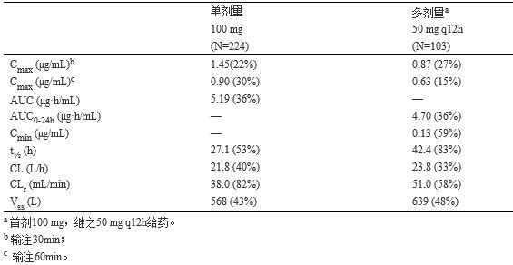 根据临床药理学研究汇总资料,替加环素单剂量和多剂量静脉给药后的平均药代动力学参数总结见下表。替加环素静脉输注时间大约30~60分钟。