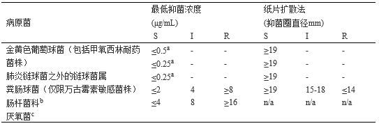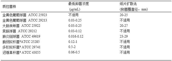 a 近期未分离到耐药菌株,所以预先排除了 “敏感”之外的其他任何结果定义。 MIC结果提示 “不敏感”的菌株应该提请参考实验室进行进一步检测。