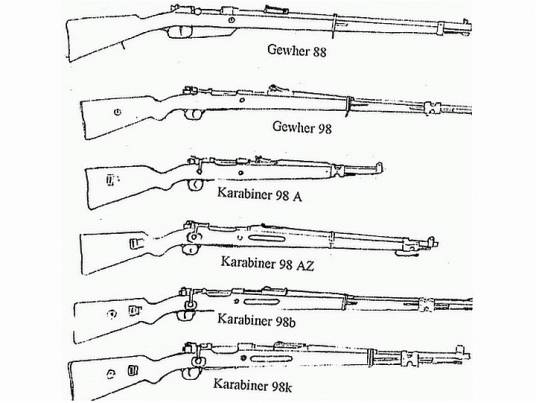 Gew.98式步枪除了标准型外,还有一种很短的卡宾枪型,被德国军队命名为Karbiner 1898(1898型卡宾枪),缩写成Kar.98或K98。Gew.98步枪直到第二次世界大战结束前都是德国军队步兵的制式步枪,而Kar.98式卡宾枪主要是装备炮兵部队和骑兵部队。