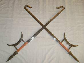 双戟护手钩法共有两路,一路名云钩,二路名花钩。该套路为清朝末年武术名家“大刀王五”在宁所传。笔者家父有幸习得此钩,传于我辈,习练至今已历三代。凡是习练过双戟护手钩的武林朋友,均有“双钩在手,精神陡增,两臂有力,气贯全身”之快感。