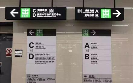 贵阳轨道交通在路口有专门的立柱标识牌表明附近有地铁车站,并写明地铁线路、站名及距离。在地铁车站的入口旁立有“贵阳轨道”字样的立柱标识牌,立柱标示牌上标有车站入口编号、首末班车时间表供乘客参考使用,合理安排出行计划。