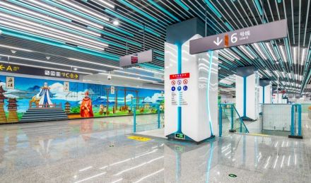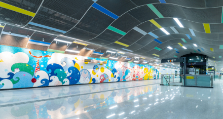金府站 | 以“青春活力”为主题,灵感源于紧邻的欢乐谷过山车等游乐设施的曲线造型,通过曲线造型和多色色带,表达欢快和动感的游乐气氛。运用鲜明的色彩对比,展现出一个梦幻的世界。 |