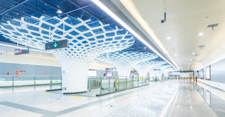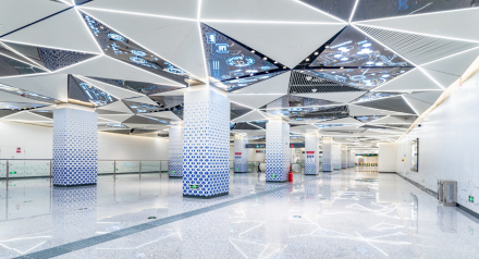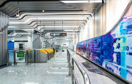 金融城东站 | 以“科技金融创新”为主题,通过对可视化的“金融数据”及代表科技核心的“芯片电路”提取动感、强劲的线性元素,并以白色金属为基底,金、银作为点缀性主题色,赋予金融城东站时尚、科技的空间特征。 |