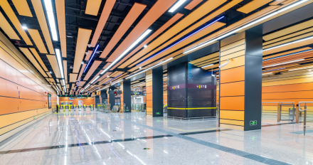 东郊记忆站 | 以“工业新音”为设计主题,空间运用充满力量感的“工业化”形象色彩、肌理进行打造,构成方式主要为线性表现,并结合充满律动的灯光、生动的多媒体艺术品表现,让乘客穿梭于时间与光影的空间氛围里 。 |