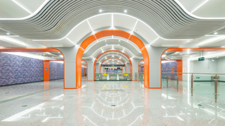 理工大学站 | 以“蜀地绝响”为设计主题,将理工大学地质、能源等教育科研领域的特色作为创作出发点,以风蚀地貌的概念进行空间构筑,换乘区域通过富有象征性的“生物化石”天花构成进行过渡,强调空间聚合力和次序感 。 |