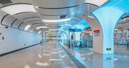 川大江安校区站 | 以“风华正茂”为设计主题,将展开的“书本”作为空间延展的主体装饰构造,“书页”片状的组合形式活泼、清逸,通过冰蓝色灯光的渲染,展现川大新校区现代、朝气的精神风貌和活力 。 |