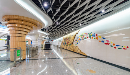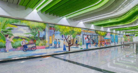 芳草街站 | 以“玉林百态”为设计主题,提取玉林片区街景风貌的特点,以绿色为基调,通过对金属材料的镂空处理,将空间营造出树影婆娑的质感,空间极富张力,宁静而惬意,与玉林片区的生活及人文内涵相得益彰,将为乘客提供别样的车站空间体验 。 |