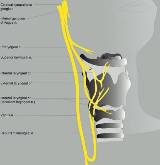 2、喉下神经:是迷走神经的喉返神经末梢支。喉下神经进入喉内,分为前后二支。前支分布于环杓侧肌、甲杓肌、声带肌、杓会厌肌和甲会厌肌。后支分布于环杓后肌、杓横肌、杓斜肌,并发出细支分布于声带尾侧部的粘膜。此外,还有分支,与喉上神经的内支相交通。