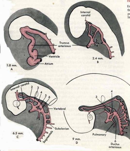 保留第三、四、六对动脉弓,形成颈动脉、体动脉、肺动脉。但是在成体中,鸟类左体动脉弓退化,哺乳类右体动脉弓退化。