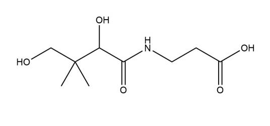 维生素B5的化学式为C9H17NO5,有旋光性,仅D型(=+37.5°)有生物活性。消旋维生素B5具有吸湿性和静电吸附性;纯游离维生素B5是一种淡黄色粘稠的油状物,具酸性,易溶于水和乙醇,不溶于苯和氯仿。维生素B5在酸、碱、光及热等条件下都不稳定。