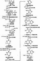 (1)5-磷酸核糖的活化:嘌呤核苷酸合成的起始物为α-D-核糖-5-磷酸,是磷酸戊糖途径代谢产物。嘌呤核苷酸生物合成的第一步是由磷酸戊糖焦磷酸激酶(ribose phosphate pyrophosphohinase)催化,与ATP反应生成5-磷酸核糖-α-焦磷酸(5-phosphorlbosyl?α-pyrophosphate PRPP)。此反应中ATP的焦磷酸根直接转移到5-磷酸核糖C1位上。PRPP同时也是嘧啶核苷酸及组氨酸、色氨酸合成的前体。因此,磷酸戊糖焦磷酸激酶是多种生物合成过程的重要酶,此酶为一变构酶,受多种代谢产物的变构调节。如PPi和2,3-DPG为其变构激活剂。ADP和GDP为变构抑制剂。