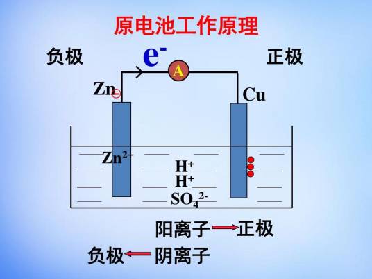 通过氧化还原反应而产生电流的装置称为原电池,也可以说是将化学能转变成电能的装置。有的原电池可以构成可逆电池,有的原电池则不属于可逆电池。原电池放电时,负极发生氧化反应,正极发生还原反应。例如铜锌原电池又称丹尼尔电池,其正极是铜极,浸在硫酸铜溶液中;负极是锌板,浸在硫酸锌溶液中。两种电解质溶液用盐桥连接,两极用导线相连就组成原电池。平时使用的干电池,是根据原电池原理制成的。