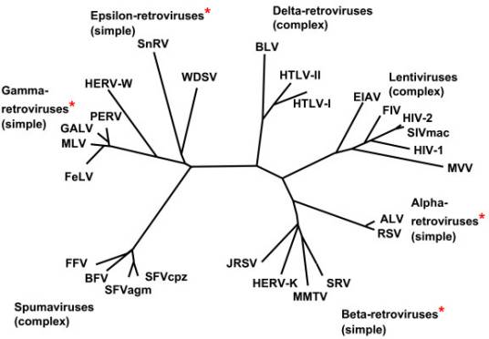 肿瘤病毒亚科 | (禽类)rous肉瘤病毒(RSV),rous 相关病毒(RAV),其他鸡肉瘤病毒,禽白血病病毒(ALV) (哺乳类)鼠肉瘤病毒(MSV),鼠白血病毒(MLV),鼠内源性病毒,猪肉瘤病毒,牛白血病病毒,猪白血病病毒,鼠乳腺瘤病毒 (灵长类)灵长类肉瘤病毒,猴白血病病毒,狒C型肿瘤病毒,mason-pfizer猴病毒(MPMV),langur病毒 (人)人类嗜T细胞病毒Ⅰ型,Ⅱ型,Ⅴ型(HTLV-Ⅰ,Ⅱ,Ⅴ) |