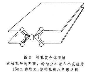 核膜上有成千上万个核孔,每个大的核孔复合体都有约100nm左右长,而在内核膜上的孔道大约有40nm宽,核孔能连接内外核膜。