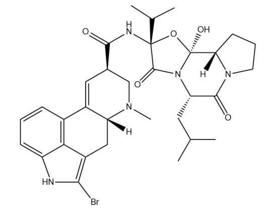 溴隐亭,分子式为 C32H40BrN5O5,是一种多巴胺受体激动剂,属于麦角灵的衍生物。主要用于治疗:抗震颤麻痹,闭经或溢乳,抑制生理性泌乳、催乳激素过高引起的经前期综合征,肢端肥大症,女性不育症和亨丁顿舞蹈病。 临床用于治疗帕金森病,治疗与催乳素有关的生殖系统功能异常,如闭经、溢乳症、经前综合征、产褥期乳腺炎、纤维囊性乳腺瘤、男性阳痿或性欲减退。还可用于垂体腺瘤等。