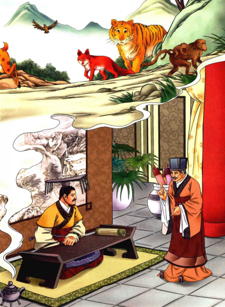 “可是当它张开嘴巴,正准备把那只狐狸吃进肚子里的时候,狡猾的狐狸突然说话了:‘哼!你不要以为自己是百兽之王,便敢将我吞食掉;你要知道,天帝已经命令我为王中之王,无论谁吃了我,都将遭到天帝极严厉的制裁与惩罚。’老虎听了狐狸的话,半信半疑,可是,当它斜过头去,看到狐狸那副傲慢镇定的样子,心里不觉一惊。原先那股嚣张的气焰和盛气凌人的态势,竟不知何时已经消失了大半。虽然如此,它心中仍然在想:我因为是百兽之王,所以天底下任何野兽见了我都会害怕。而它,竟然是奉天帝之命来统治我们的!