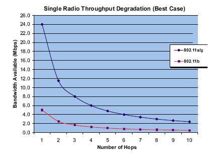 在802.11b情况下,此表的起始吞吐量为5 Mbps--因为802.11b任何信道的毛数据速率为11 Mbps,其有效吞吐量接近于5 Mbps。类似地,802.11a/g的有效吞吐量接近于24 Mbps。正像前表中所显示的一样,在无噪声环境下的结果显示了仅仅5跳带宽就会有80%丢失。即使在最佳情景的时候,对于中等规模和大规模环境,带宽的损失也是不可接受的。