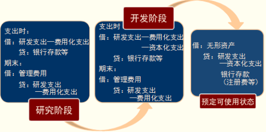 “研发支出”账户属于成本类,借方反映企业自行开发无形资产发生的研发支出,贷方反映期末结转的不满足资本化条件的费用化支出以及满足资本化条件并已达到预定用途形成无形资产的资本化支出。期末借方余额反映正在进行研发的无形资产项目满足资本化条件的支出。总账下设置“费用化支出”、“资本化支出”两个明细账。