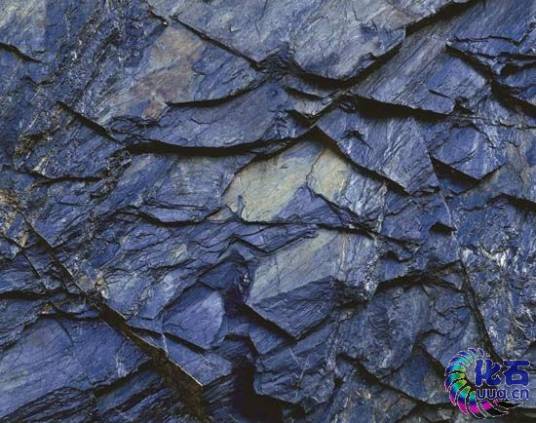 千枚岩。区域变质岩,黄、绿或蓝灰色,隐晶质变晶结构,千枚状构造,主要矿物为石英、绿泥石、绢云母;8.
