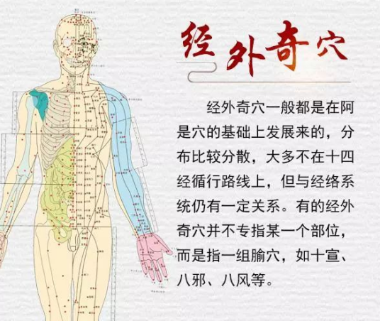 简称为奇穴。经外奇穴一般都是在阿是穴的基础上发展来的,其中部分穴位如膏肓俞、厥阴俞等,后来还补充到十四经穴中,可见经外奇穴本身又是经穴发展的来源。