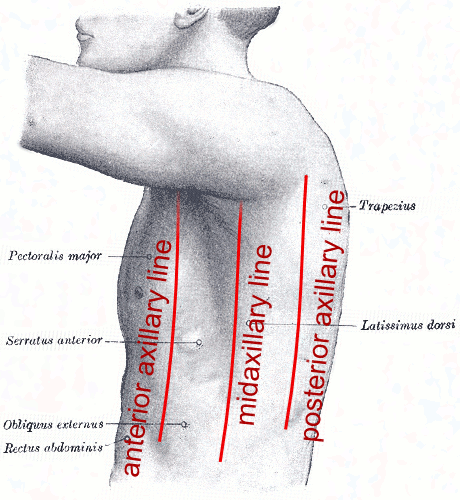 位于腋前线与腋后线之间,由腋窝中央 (腋窝顶) 向下作的垂线。