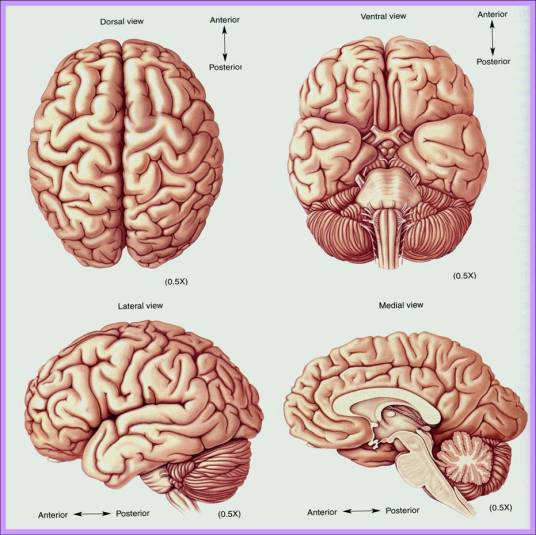 在半球表面有各种走向的沟即大脑沟(sulcus cerebri),由其主要的沟或裂把每一半球分为额叶(lobus frontalis)、顶叶(lobus parietalis)、枕叶(lobus occipitalis)、颞叶(lobus temporalis)和脑岛(insula)。脑岛被其他叶所遮盖,在自然位置条件下看不见。额叶的外侧面进一步由数条沟将之分为中央前回(gyrus praecentralis)。额上回(gyrus frontalis superi-or)、额中回(gyrus frontalis medius)、额下回(gyrus frontalis inferior),下面位于眼窝的近上方,在内侧有前后走行的嗅沟,该处有嗅球(bulbus olfactorius)和嗅束(tractus olfacto-rius),为由嗅觉神经末稍向中枢的通路。顶叶的外侧面与中央沟(sulcus centralis)为界,在额叶的后方分为中央后回(gyrus postcentralis)、顶上叶(lobulus parietalis superior)、顶下叶(lobulus parietalis inferior),但后者又分为前端的环曲回(gyrus circumflexus)和后端的角回(gyrus angularis)。枕叶的沟和回都不规则,但猿类所存在的猿回(德 Affenspalte)在人类有的也有。颞叶是顶叶后下部和枕叶的向前外侧突出的部分,在额叶和顶叶前部之间有大脑外侧裂(fissura cerebri lateralis)。