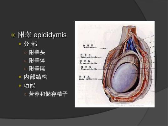 附睾呈新月形,紧贴于睾丸的上端和后缘,共分为头、体、尾三个部分。其中头部位于睾丸上端,由输出小管盘曲形成;体部和尾部位于睾丸后缘,由进入附睾头的多条输出小管最终汇合而成的附睾管构成。