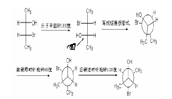 出现这种费歇尔投影式十字架下方的碳对应纽曼投影式前碳不对应的情况,需要将费歇尔投影式在平面内转动 180º,此过程中分子构型不会改变。再写成纽曼投影式,然后转动纽曼投影式前碳和后碳到题目要求的位置,或者使用手势法用食指和拇指对应Br和-OH。