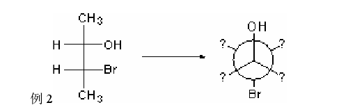 手势法和方位法的本质都是一样的,手势法只是替换了解题中角度的旋转显得更加简便,更重要的是对于碳C1和碳C2的对应关系的把握。如下图已给出-OH和-Br,要求写出余下基团的排布。但如果直接使用手势法就会错误,原因在纽曼式中圆圈代表碳2,人字代表碳1。但在费歇尔式中-OH基团与C2相连,而Br与C1相连,排布恰恰是相反的。