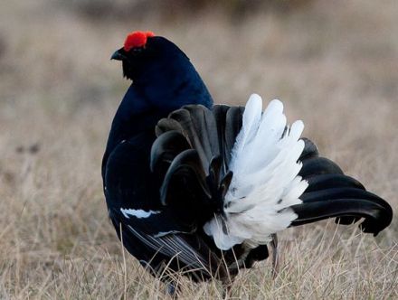 新疆黑琴鸡体羽的黑褐色较暗,头、颈、下背及腰等部羽色深蓝带绛红色光泽。