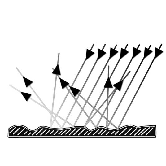 当一束平行的入射光线射到粗糙的表面时,因面上凹凸不平,所以入射线虽然互相平行,由于各点的法线方向不一致,造成反射光线向不同的方向无规则地反射,这种反射称之为“漫反射”或“漫射”。这种反射的光称为漫射光。很多物体,如植物、墙壁、衣服等,其表面粗看起来似乎是平滑,但用放大镜仔细观察,就会看到其表面是凹凸不平的,所以本来是平行的太阳光被这些表面反射后,弥漫地射向不同方向。