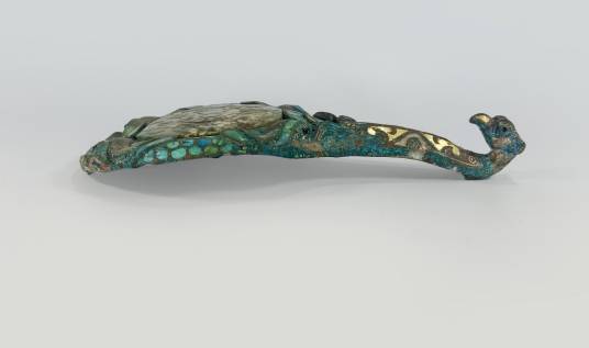 另外,一般素面铜带钩市场价位不高,所以作伪者粗制滥造,稍有收藏经验的人都能识别真假。铜带钩作伪最多的是老体新工。所谓老体新工,就是老的素面青铜带钩上错金、错银、镶嵌绿松石。