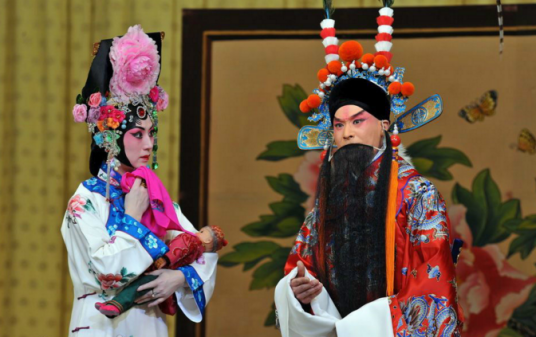 《打龙袍》“一见皇儿跪埃尘”这段老旦西皮流水,是剧中人李后,在看到自己的亲生儿子、当今的皇上跪在自己面前后,十分激动的用这一段西皮流水板,倾诉了她二十年的冤枉。唱腔结构与上面欣赏过的老生西皮流水相同。