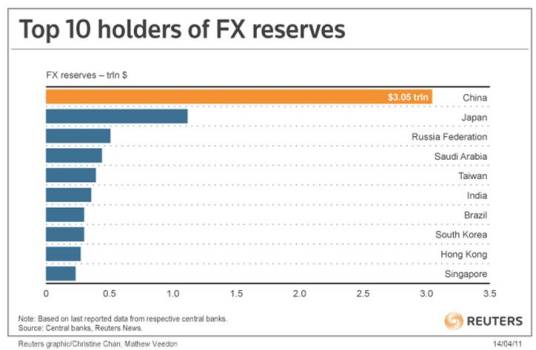 截至2006年2月底,中国大陆的外汇储备总额为8537亿美元(不包括港澳的外汇储备),首次超过日本,位居全球第一。截止2008年4月末,中国的外汇储备增加到1.76万亿美元,比东北亚其他国家和地区外汇储备的总和还多,有学者认为,这个数字已经超过了世界主要7大工业国(包括美国、日本、英国、德国、法国、加拿大、意大利,简称G7)的总和。随后,中国的外汇储备持续上升,截至2008年9月末,达到创纪录的19056亿美元。受全球金融危机的影响,加之美元、欧元、人民币汇率的波动,2008年10月末,中国的外汇储备已降至1.89万亿美元以下,为自2003年年底以来首次下降,截至2008年12月,中国外汇储备已达19460.30亿。2009年六月,中国的外汇储备超过了2万亿美元,中国成为全世界第一个外汇储备超过2万亿美元的国家。至2010年3月,中国的外汇储备规模达到24470.84亿美元。至2011年3月底,中国的外汇储备余额已经突破3万亿美元。