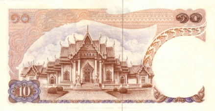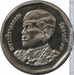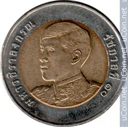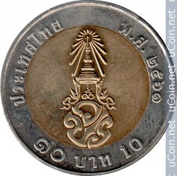 10铢正面为2006年在云天石宫殿.Ananda Samakhom君王厅举办王位继承60周年庆典时的场景。