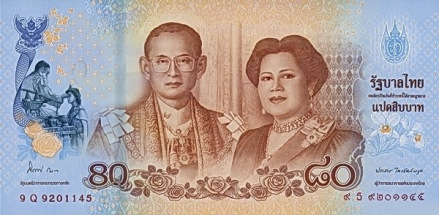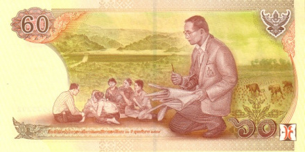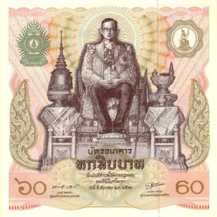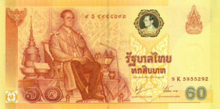 发行于1987年12月8日,为特殊的159x 159mm的尺寸,面额为60铢。正面为国王拉玛九世身穿武装部队最高统帅制服,外披长礼袍参加皇家庆典坐在御椅上的肖像。