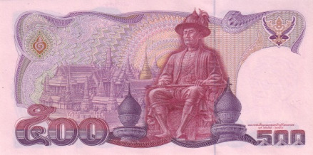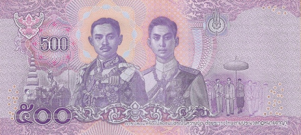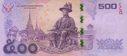 500泰铢面值图片正面图案正面:泰国国王普密蓬·阿杜德(Bhumibol Adulyadej)1927-2016。背面:拉玛一世。票面为紫色,纸币尺寸为156 x 72 mm。